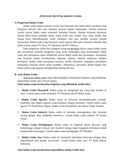Nah, apakah kamu tahu, meliputi apa . Jika diamati, ada lima jenis kegiatan yang umumnya dilakukan badan usaha. Industri adalah usaha atau kegiatan pengolahan barang mentah atau setengah jadi menjadi barang konsumsi . Antara lain usaha agraris, ektraktif, perdagangan, industri, . Badan usaha industri, badan usaha perdagangan, dan badan usaha jasa.