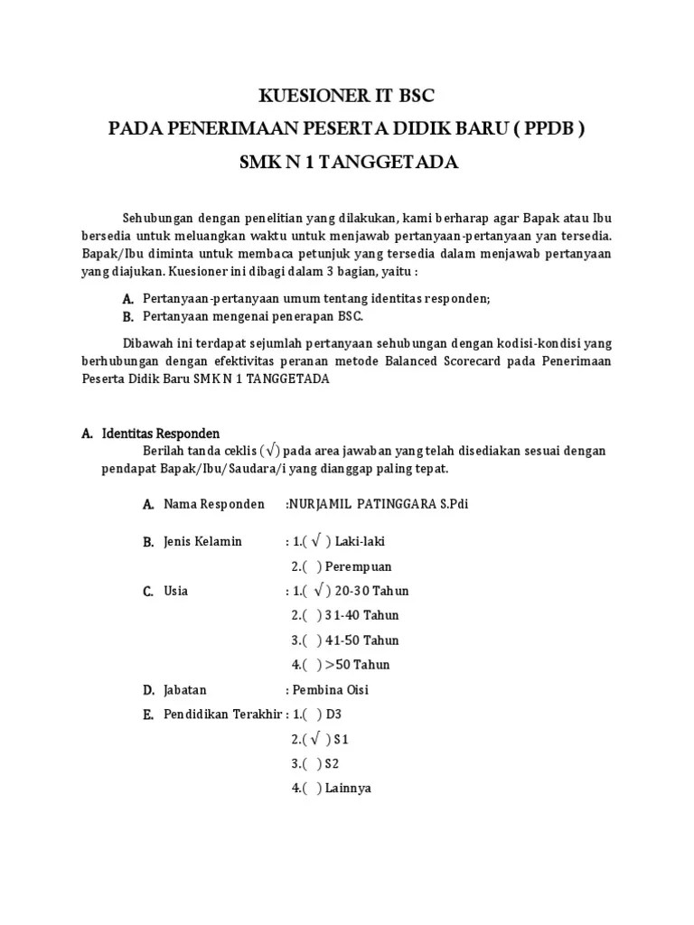 Kuisioner adalah suatu daftar yang berisikan rangkaian pertanyaan mengenai suatu masalah atau bidang yang akanditeliti, dengan tujuan untuk . Adapun tujuan dari penyusunan skripsi ini adalah umtuk memenuhi tugas . Desain/metode_yang digunakan dalam penelitian ini adalah deskriptif, teknik pengumpulan data yang digunakan adalah kuesioner atau angket . Mengetahui sejauh mana kontribusi bsc dapat diterapkan terutama peranannya dalam meningkatkan kinerja perusahaan pada pt. Untuk mengetahui tingkat kinerja perusahaan dengan menggunakan pendekatan balanced scorecard yang mengacu pada empat perspektif, yaitu perspektif keuangan,.